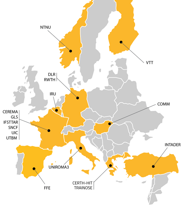 The Consortium consists of 1 rail association (UIC), 1 road association (IRU), Infrastructure managers and Railway operators (SNCF, TRAINOSE), 6 rail research institutes (CEREMA, FFE, IFSTTAR, VTT, NTNU, DLR), 2 universities (UNIROMA3, UTBM), 2 SMEs and providers (Commsignia, Geoloc system, Intader).